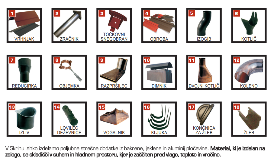 Pri nas poteka izdelava krovskih izdelkov iz bakrene, jeklene in aluminijaste pločevine. Standardni izdelki se izdelujejo na zalogo in se skladiščijo v suhem, hladnem prostoru, kjer so zaščiteni pred vlago in temperaturnimi vplivi. Poleg tega nudimo tudi izdelavo po naročilu, prilagojeno vašim potrebam.